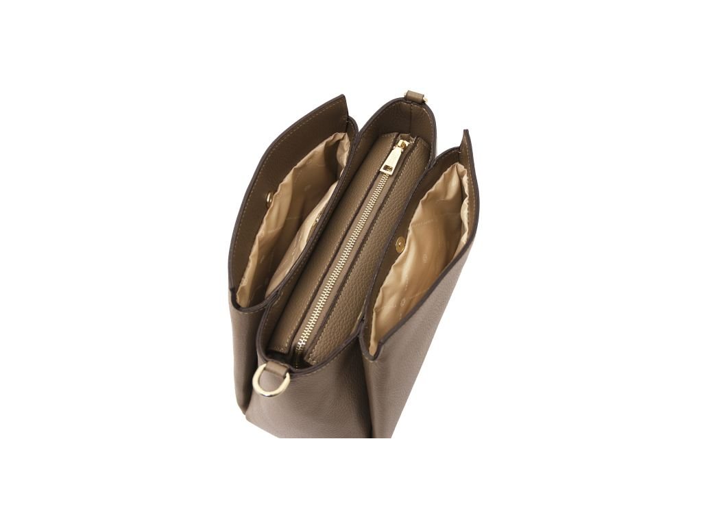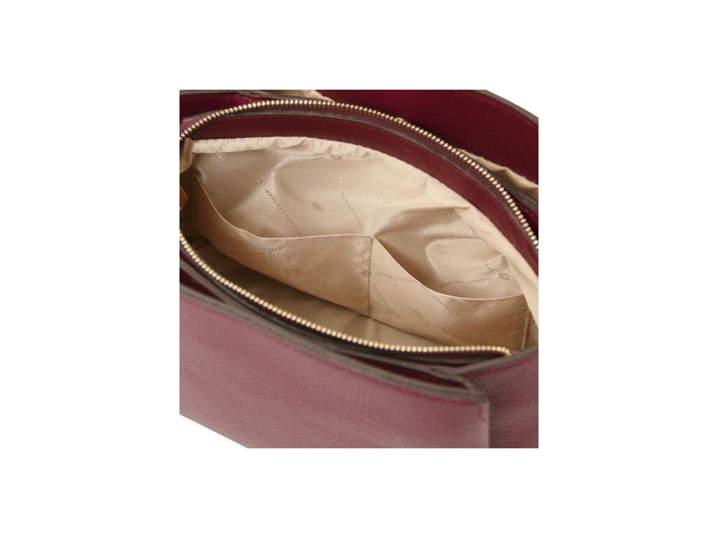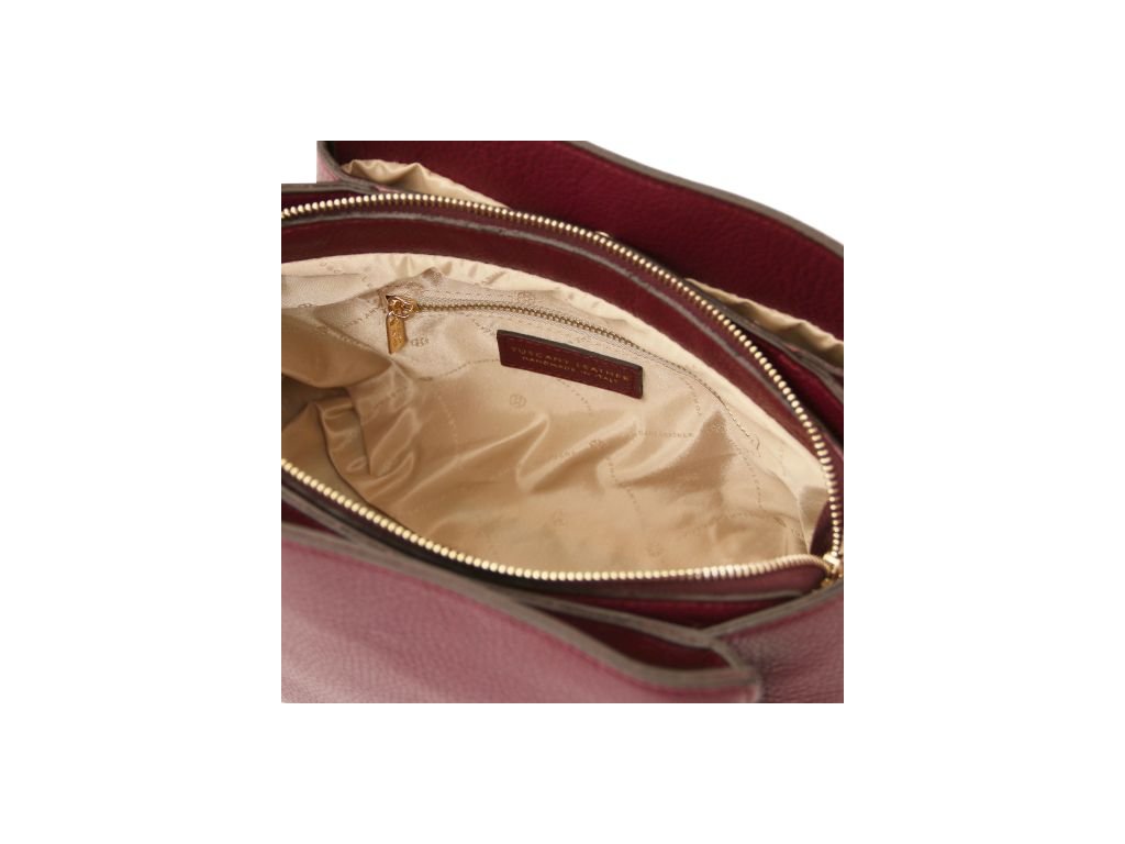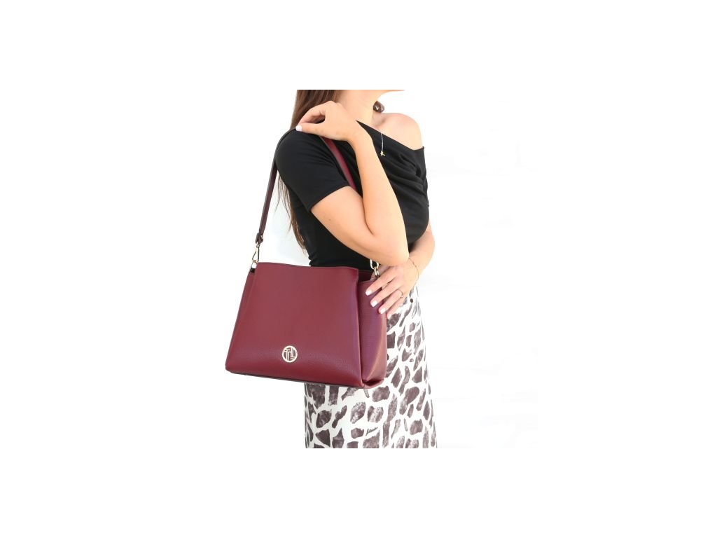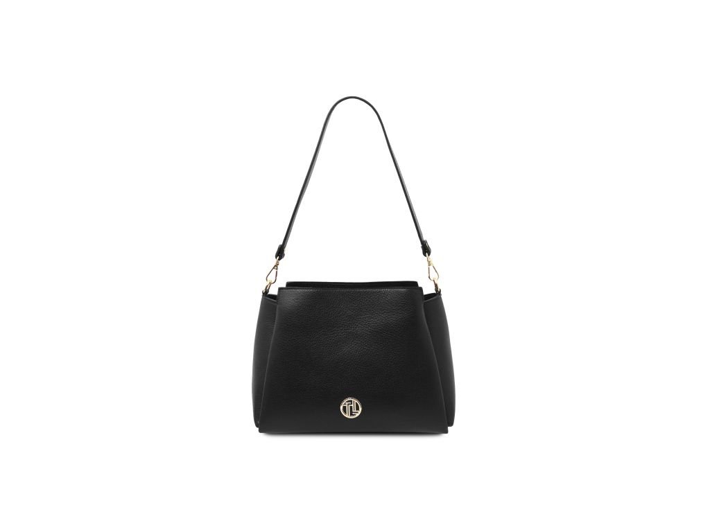 Type: Tote Bag - Composition: Pebbled leather, Polyester lining - Features: Semi-rigid structure, 3 compartments - Outside part: Metal TL logo, Protective metal feet on the bottom, 2 pockets on the sides with closure - Inside part: Zip pocket, 2 open pockets - Shoulder strap: Detachable and adjustable leather shoulder strap - Hardware: Gold-tone hardware - Closure: Zip closure, Magnetic button closure - Handles: Leather detachable handle - Accessories: Dust Bag