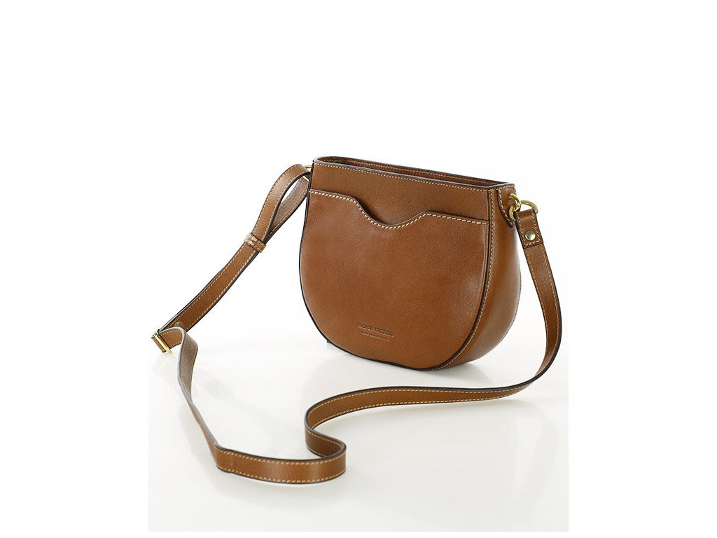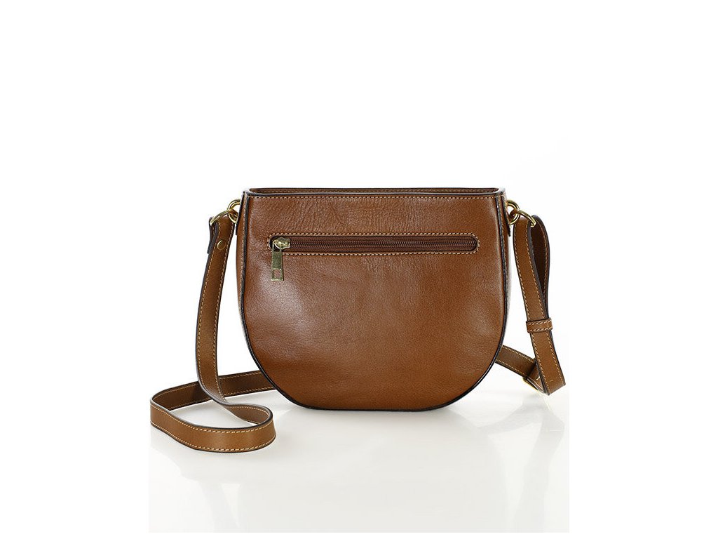 Kabelka má polkruhový tvar, uzatvára sa na zips a ponúka premyslený interiér – dve vnútorné priehradky (jedna na zips), svetlú bavlnenú podšívku a praktické vonkajšie vrecká (vpredu aj vzadu). Vďaka nastaviteľnému popruhu ju môžete nosiť ako crossbody alebo na ramene.